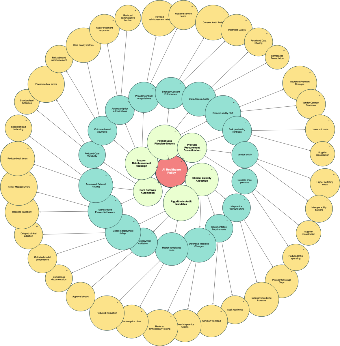 A signal, trend, or decision sits at the centre. Impacts expand outward in rings, showing how first-order effects trigger second- and third-order consequences across systems and domains.